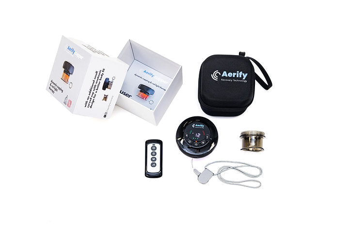 1 pc. Aerify Cupper com 1x copo de tamanho normal, 1x copo pequeno adicional com superfície curva para melhor ajuste para pescoço e braços, controle remoto, estojo rígido para proteção e transporte, cordão de segurança, 3x filtros de algodão extras, manual do usuário.