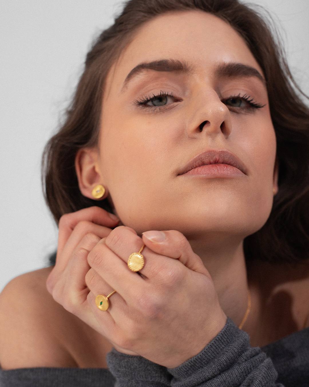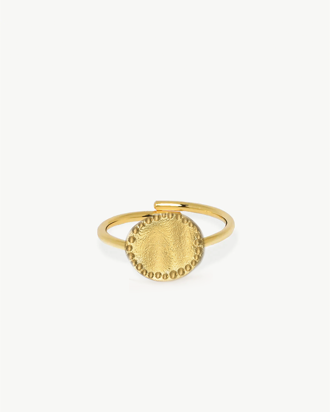 Anel ajustável em prata 925 com banho de ouro 18K oval com relevos.