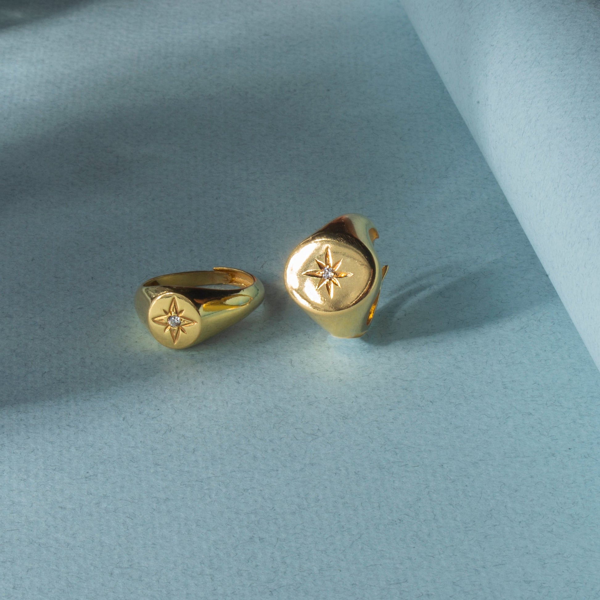 Anel signet em prata e banho de ouro ou ródio com estrela e zircónia cúbica