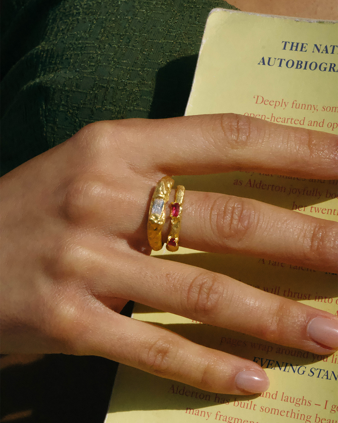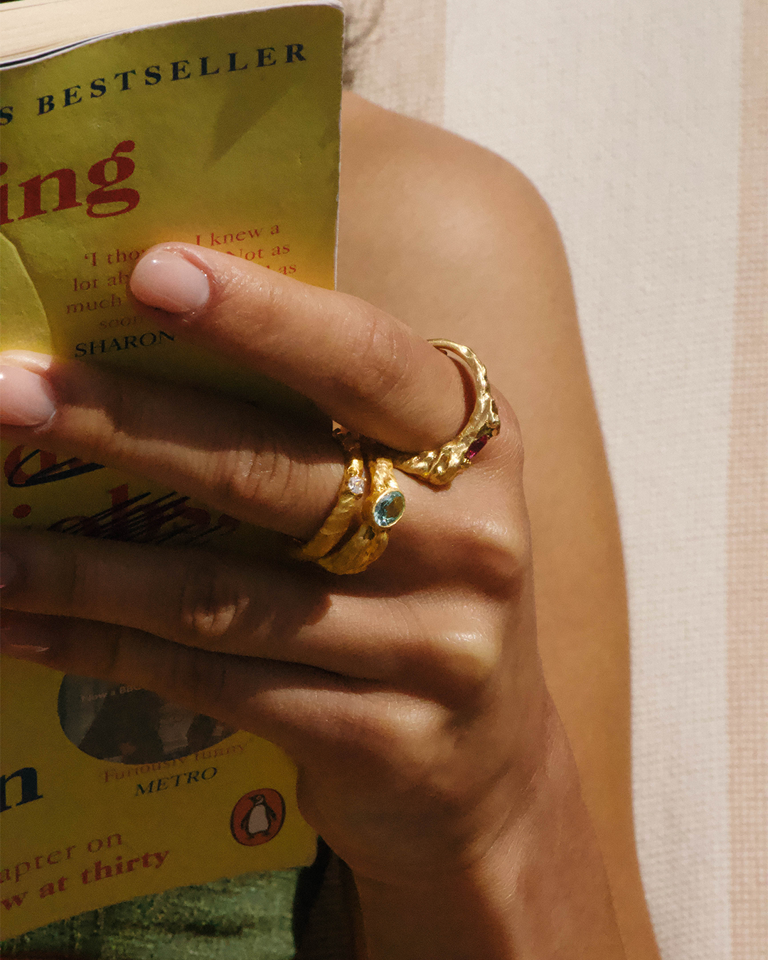Anel statement texturado em prata 925 com banho de ouro 18k e zirconias.