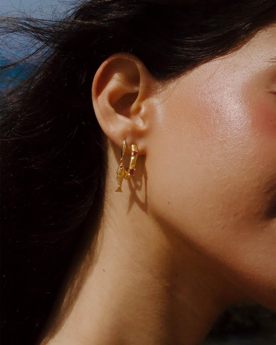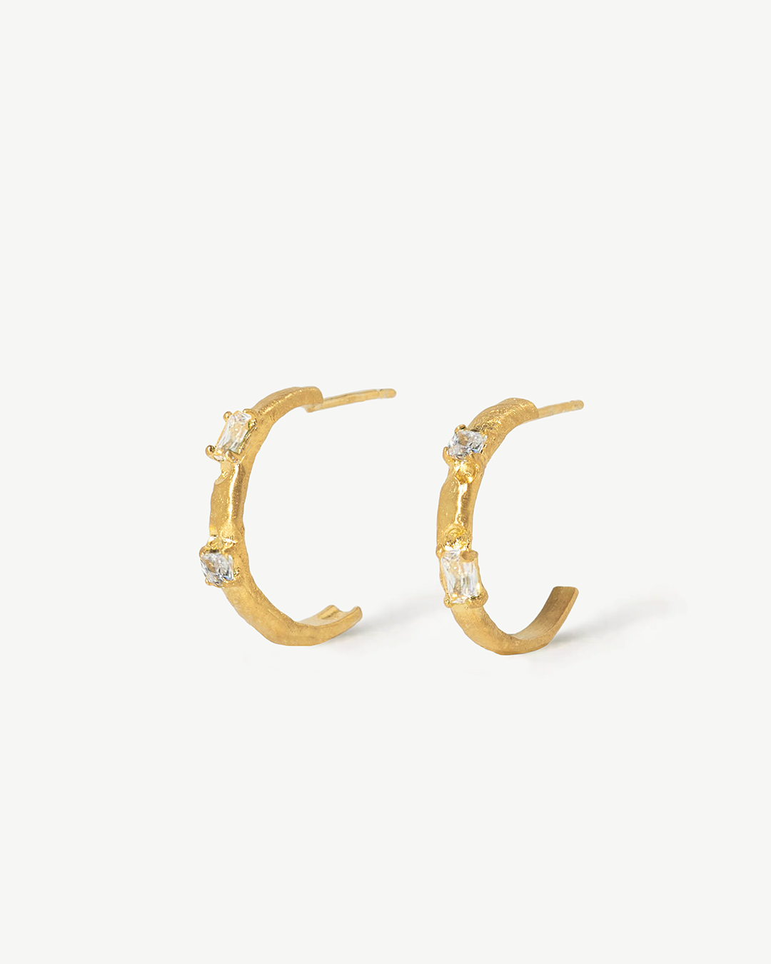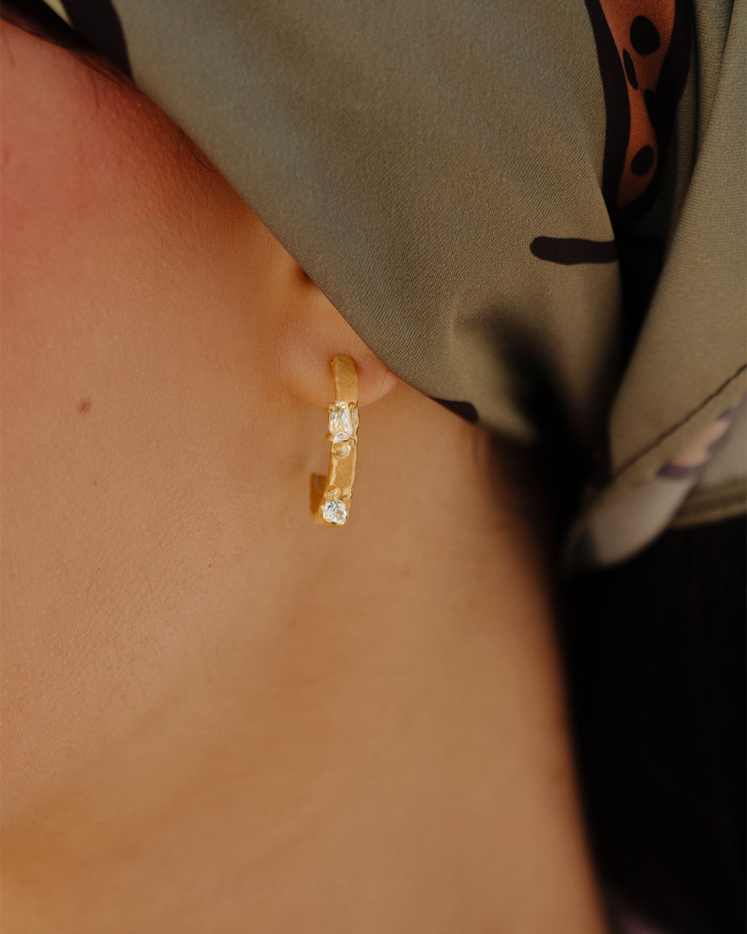 Argolas finas texturadas em prata 925 com banho de ouro 18k e zirconias.