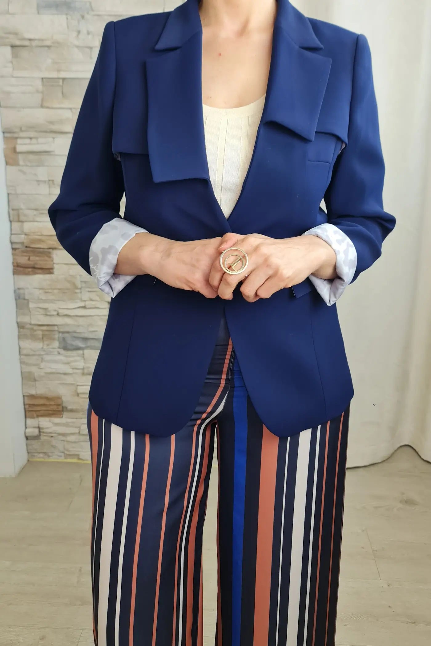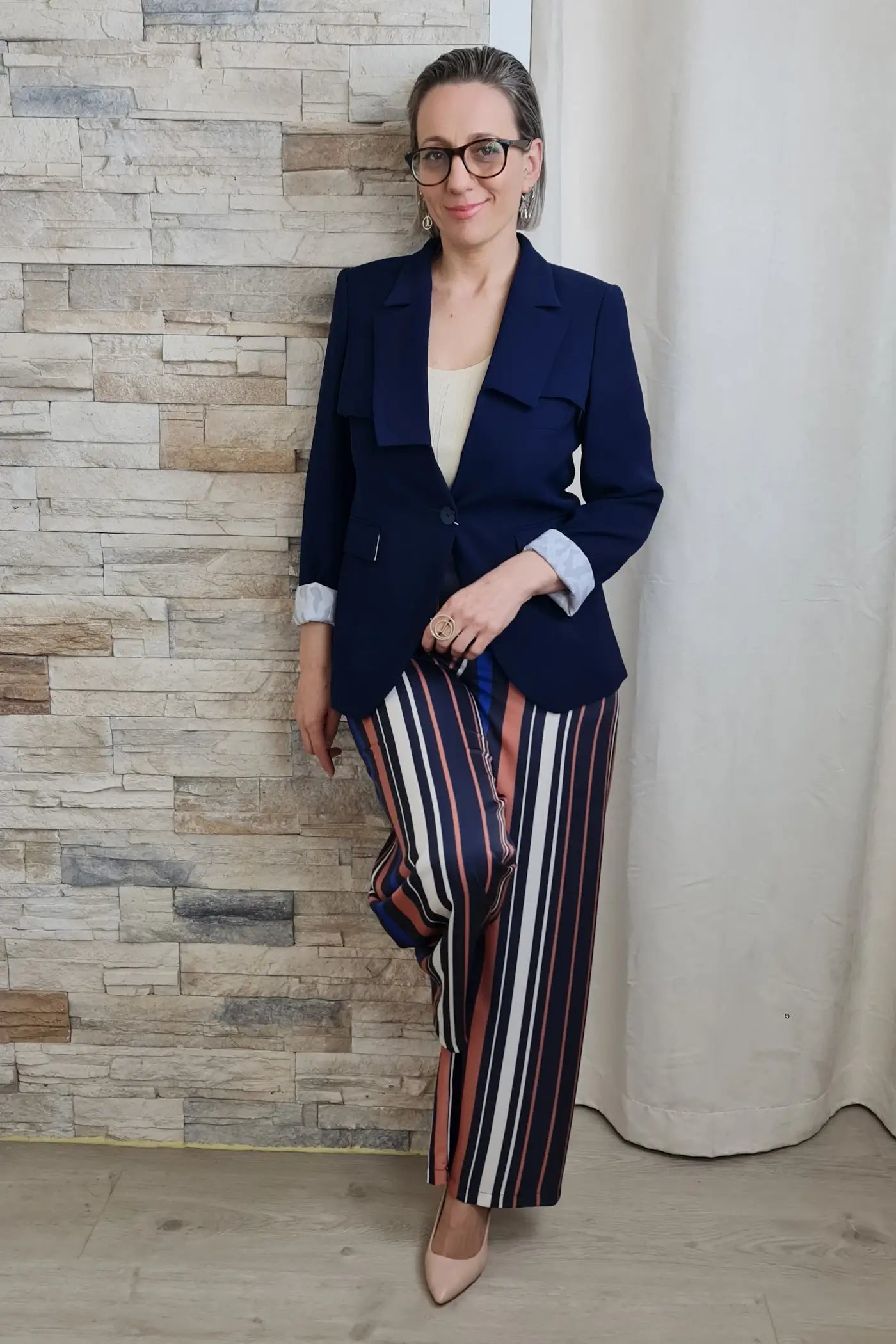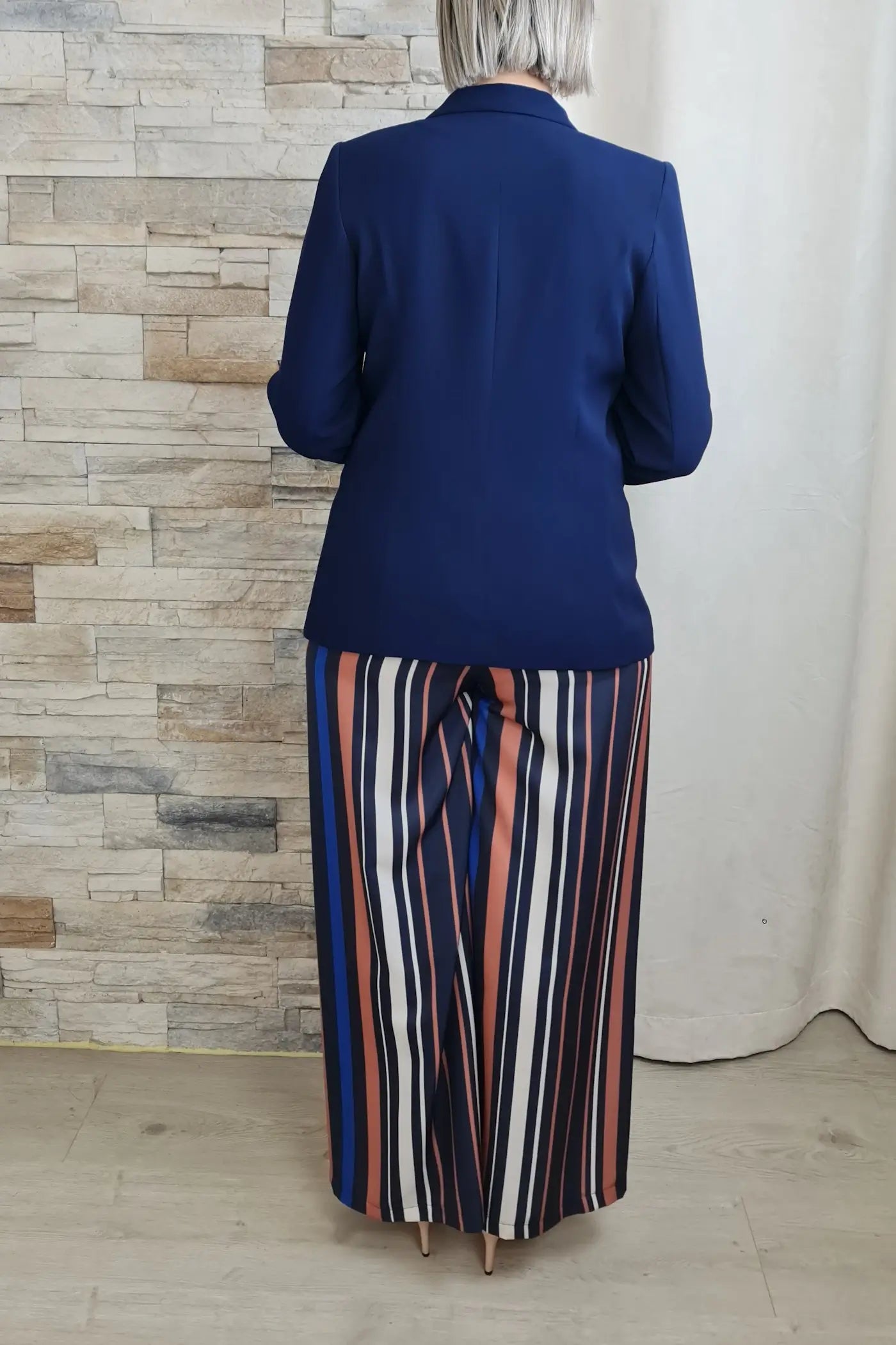 As calças apresentam um padrão às riscas verticais multicoloridos, com predominância de tons de azul-marinho, branco e laranja. As riscas são de diferentes larguras, criando um efeito visual dinâmico.