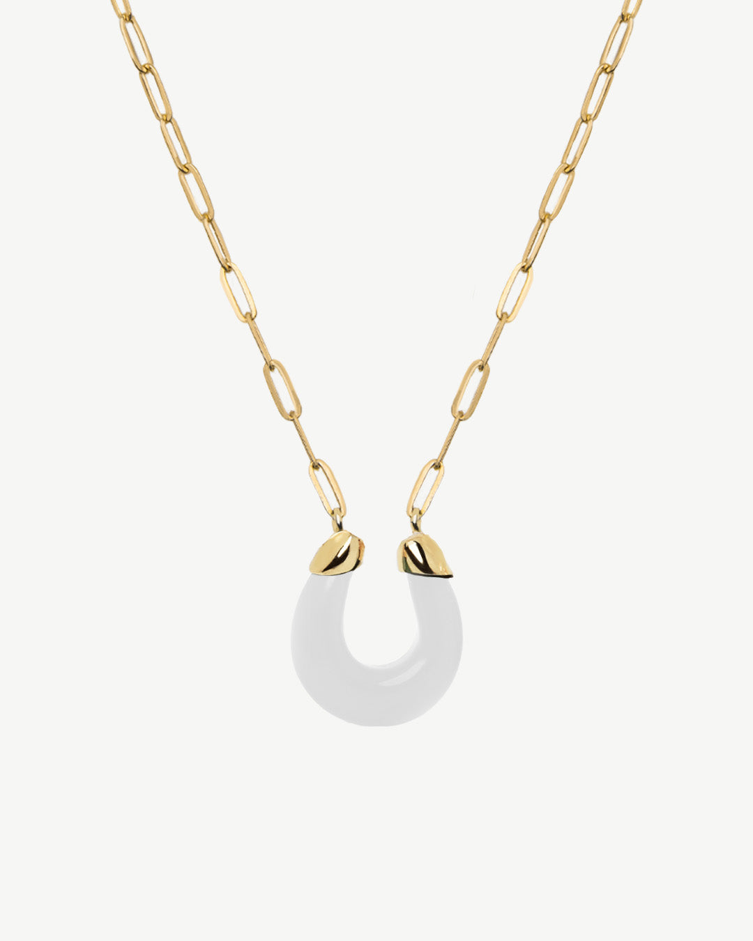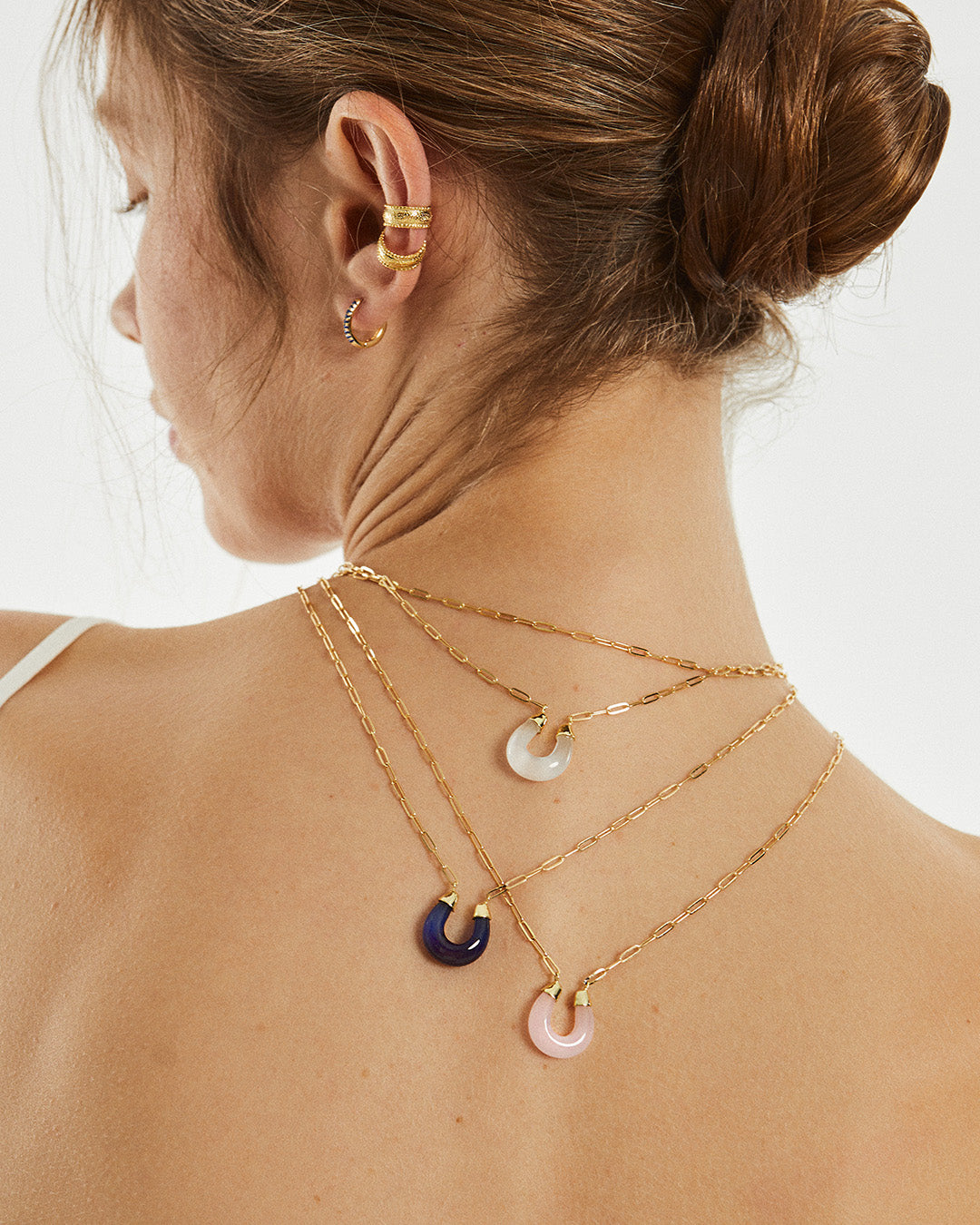 Colar em prata 925 com banho de ouro 18K e meia lua em pedra hidrotermal colorida.