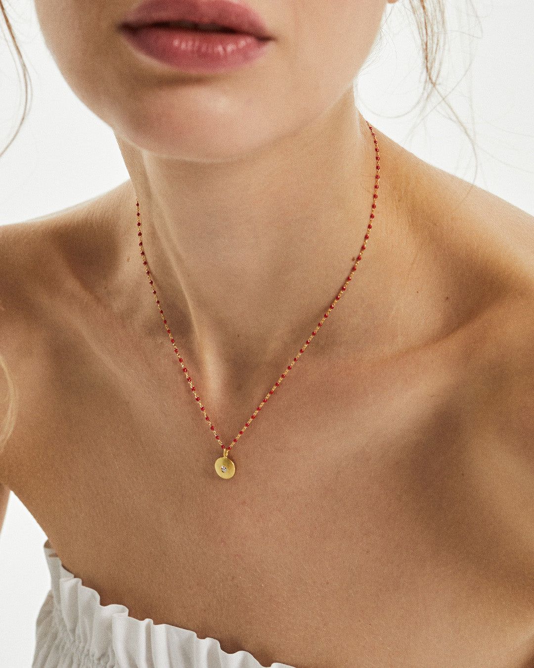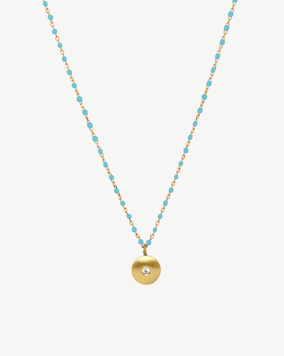 Colar de esferas em esmalte e pendente em prata com banho de ouro e zircónia cúbica.