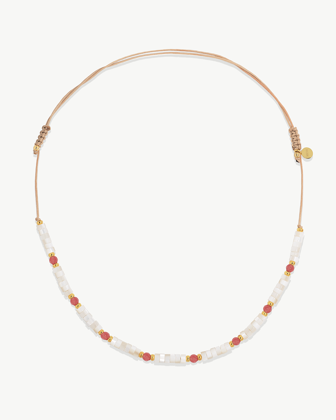 Colar ajustável em corda de algodão e fechos em macramé com pedras hidrotermais , madrepérola e prata 925 com banho de ouro.