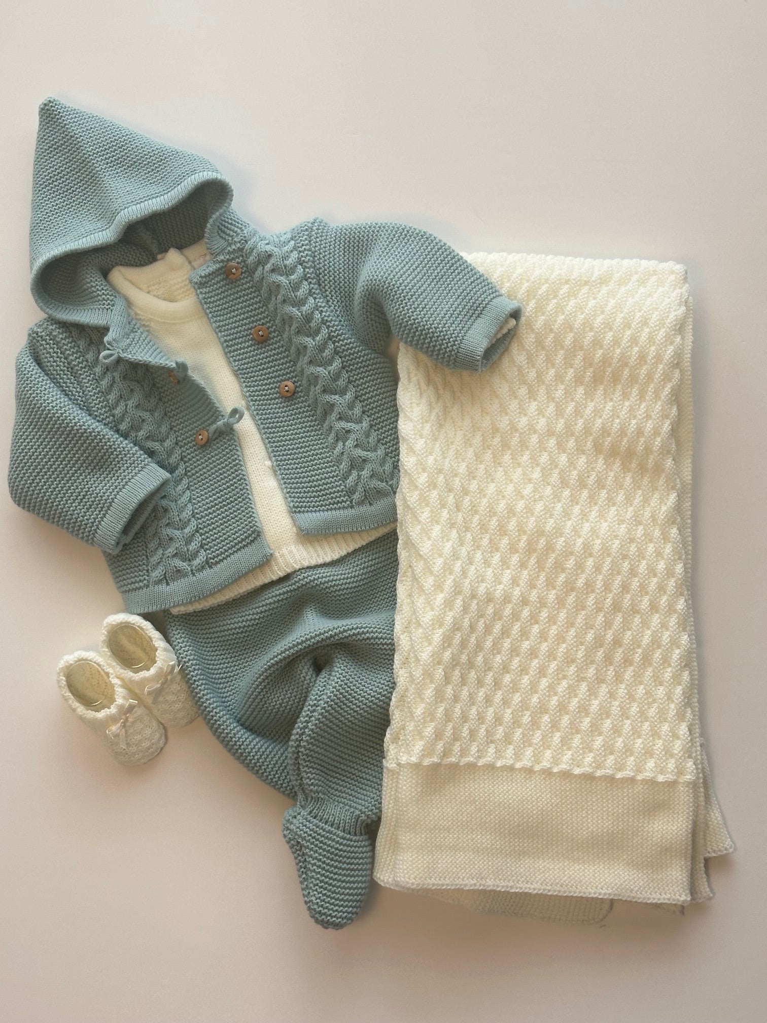Este conjunto em malha de 2 peças para bebé é a escolha ideal para proporcionar conforto, suavidade e proteção ao seu pequeno nos dias mais frescos. Produzido em malha de alta qualidade, inclui uma casaco de manga comprida com botões, umas calças aconchegantes. O design clássico e intemporal torna-o perfeito tanto para o uso diário como para ocasiões especiais, sendo também uma excelente opção para presente.