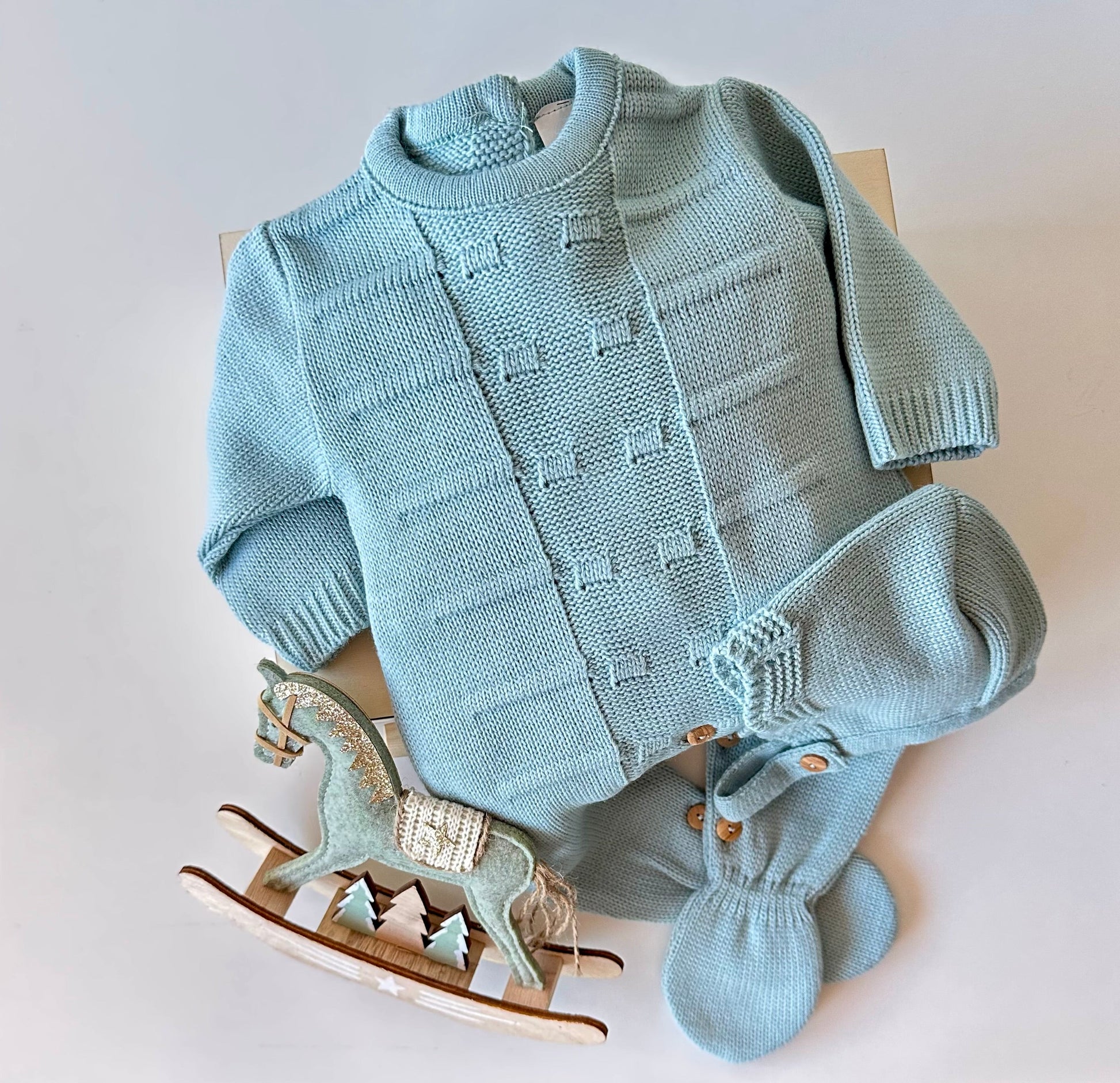 Conjunto de duas peças incluindo fato e chapéu. Uma alternativa ideal para o bebé em dias frios. Tem um design trançado muito elegante. A trança original adicionam ternura extra. Graças aos botões traseiro, a camisola torna mais fácil para o pequeno trocar de roupa.