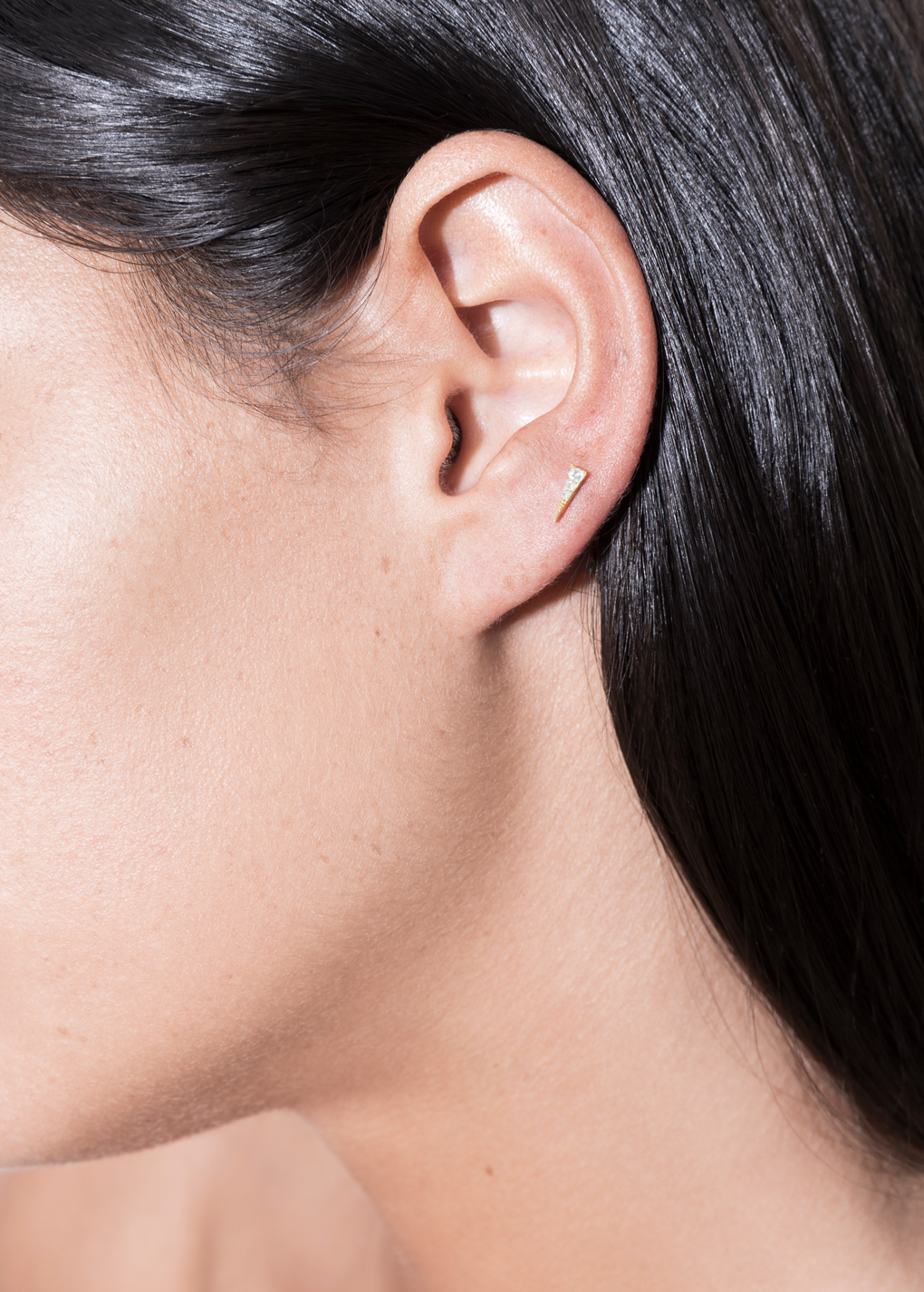 be honest about your current situation, you need this and we need it too. this 18K yellow gold CINCO earring boasts a shaped stud silhouette that’s set with 3 small diamonds, totalling 0.039 carat. this is sold as single unless otherwise stated