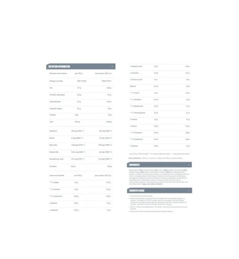 Maltodextrina, proteína do leite, concentrado de proteína de soro de leite, isolado proteico de whey, proteína whey hidrolisada, caseína micelar, cacau em pó de gordura reduzida, óleo de girassol, aromatizantes, creatina monohidratada, emulsificante (lecitina de soja), mono e diglicéridos de ácidos gordos, espessantes (goma de celulose, goma xantana, carragenina), cloreto de potássio, adoçantes (acesulfame K, sucralose), antiaglomerante (dióxido de silício), vitamina C, niacina, ácido pantotênico, vitamina B6, ácido fólico.