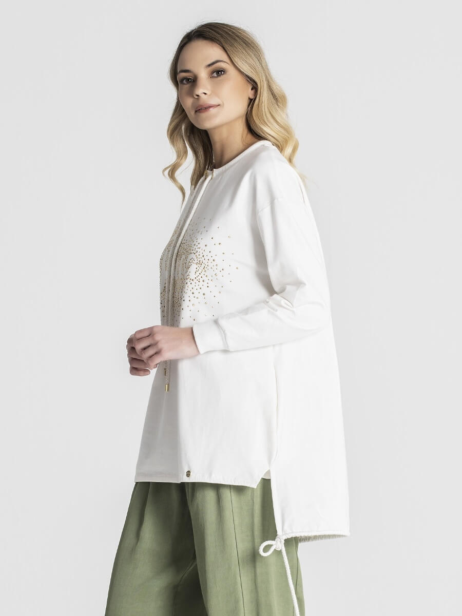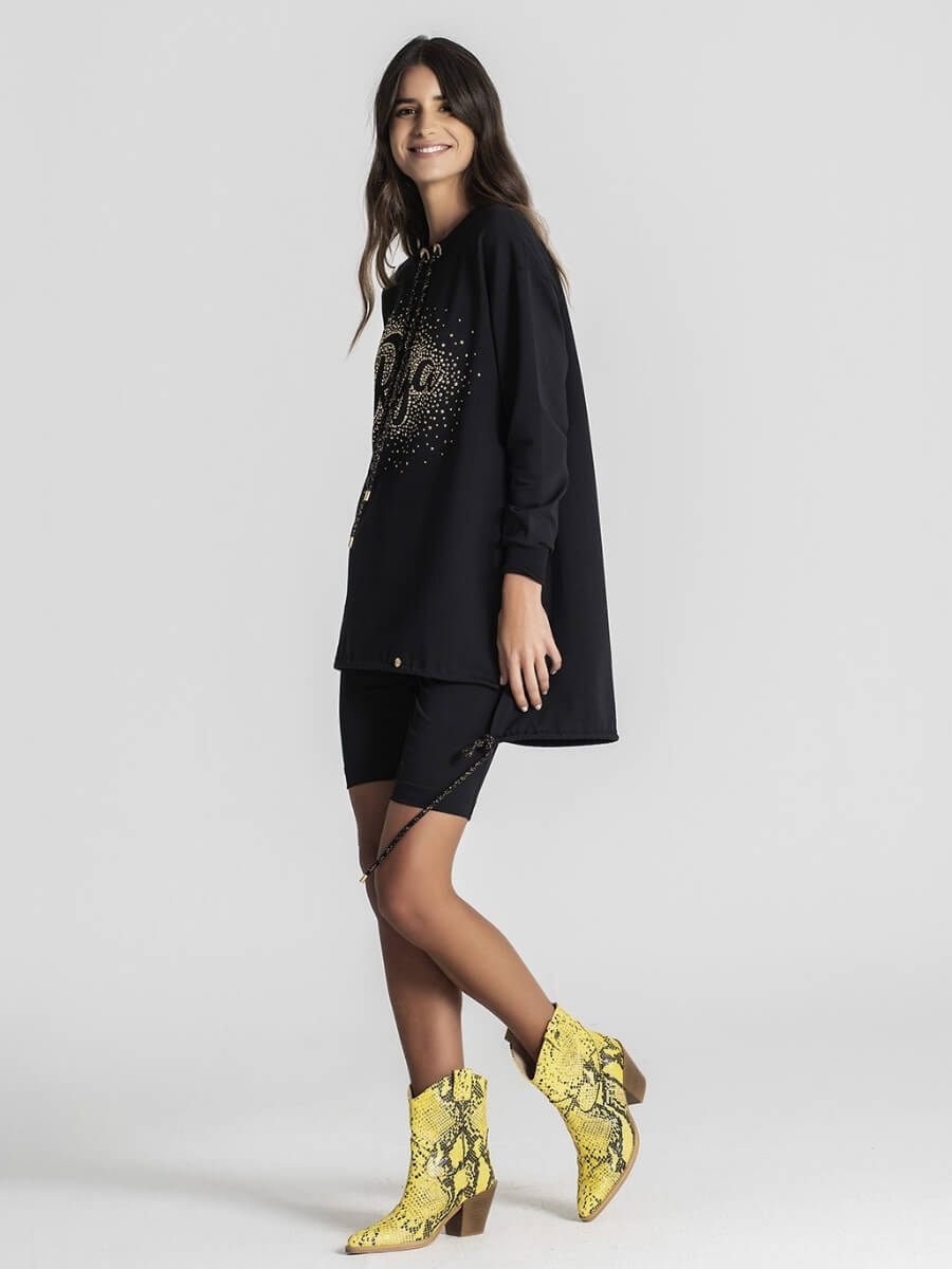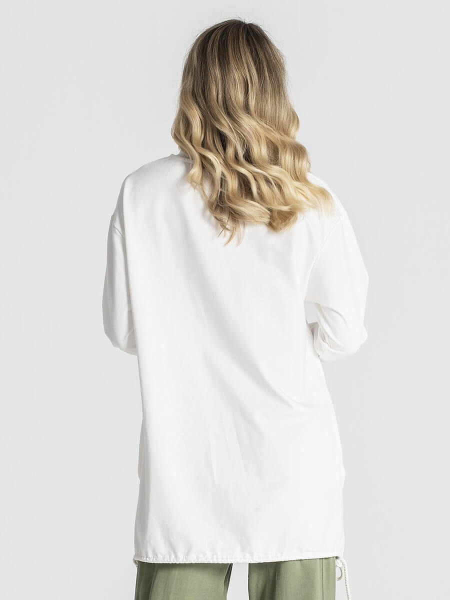 Sweater motivo ruga em transferes. Com cordão ajustável no decote e no fundo. 100% Algodão. Fabricado em Portugal