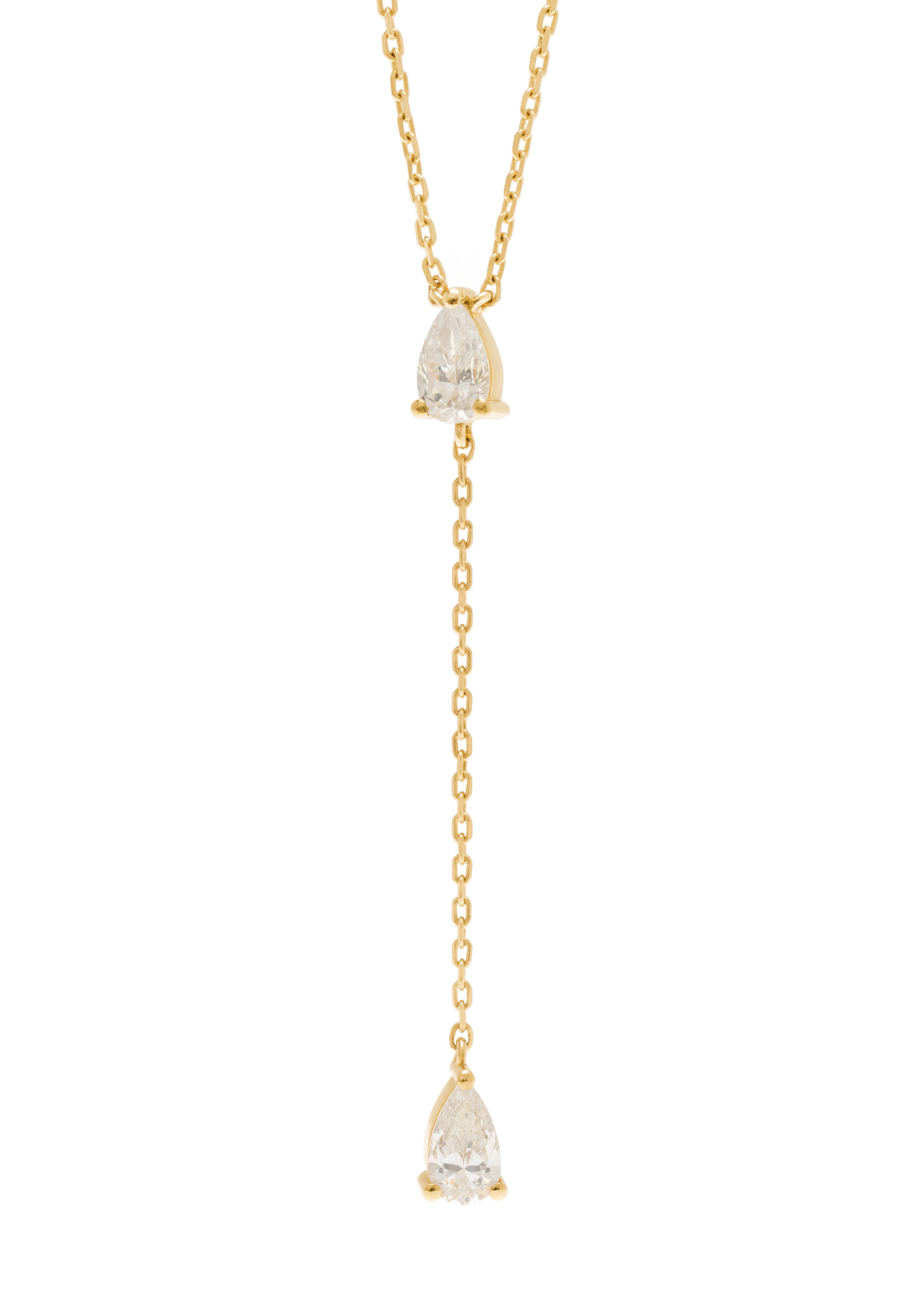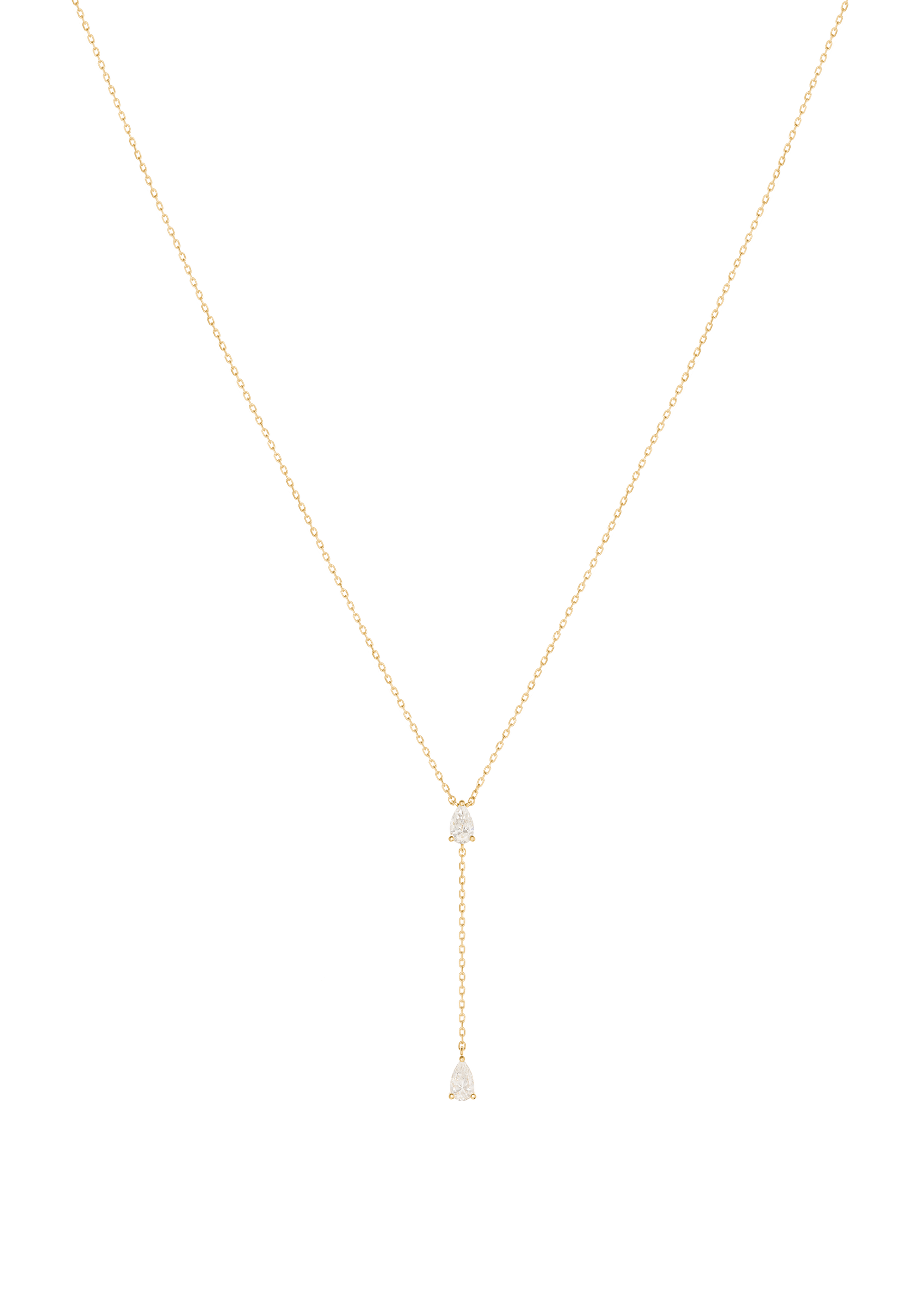 a two pear-shaped diamonds linked by fine 18-karat gold in a fluid silhouette made to move with you. engraved with CINCO logo.
